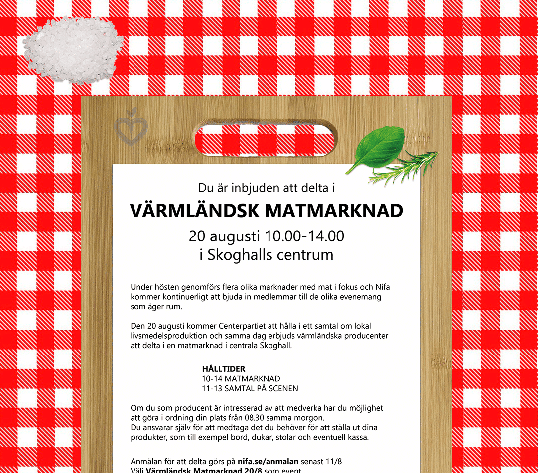 Den 20 augusti kommer Centerpartiet att hålla i ett samtal om lokal livsmedelsproduktion och samma dag erbjuds värmländska producenter att delta i en matmarknad i centrala Skoghall.