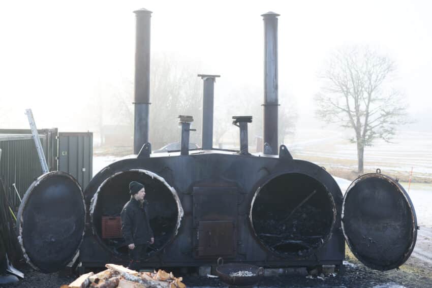 Jesper tillverkar grillkolet av björk från familjens egen skog utanför Forshaga. I den 11 ton tunga ugnen av stål eldas veden i flera dygn för att slutprodukten ska bli den perfekta kolen.
