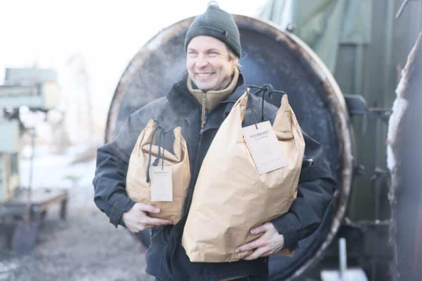 Jesper tänker cirkulärt genom hela processen. Inte nog med att råvaran kommer från egen skog och att påsarna motverkar svinn. Vid tillverkning bildas även restprodukter som björktjära och biokol som Jesper tar vara på. Inget går till spillo.