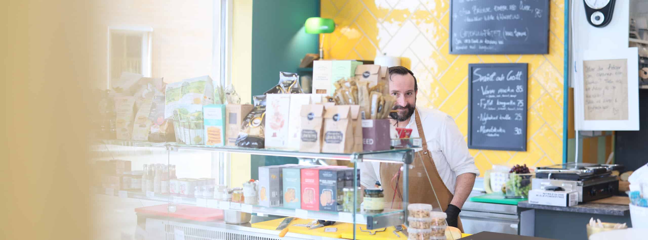 Marguerites charkuteri och delikatessbutik i bottenplan i ett av de nybyggda husen i Lillängshamnen.